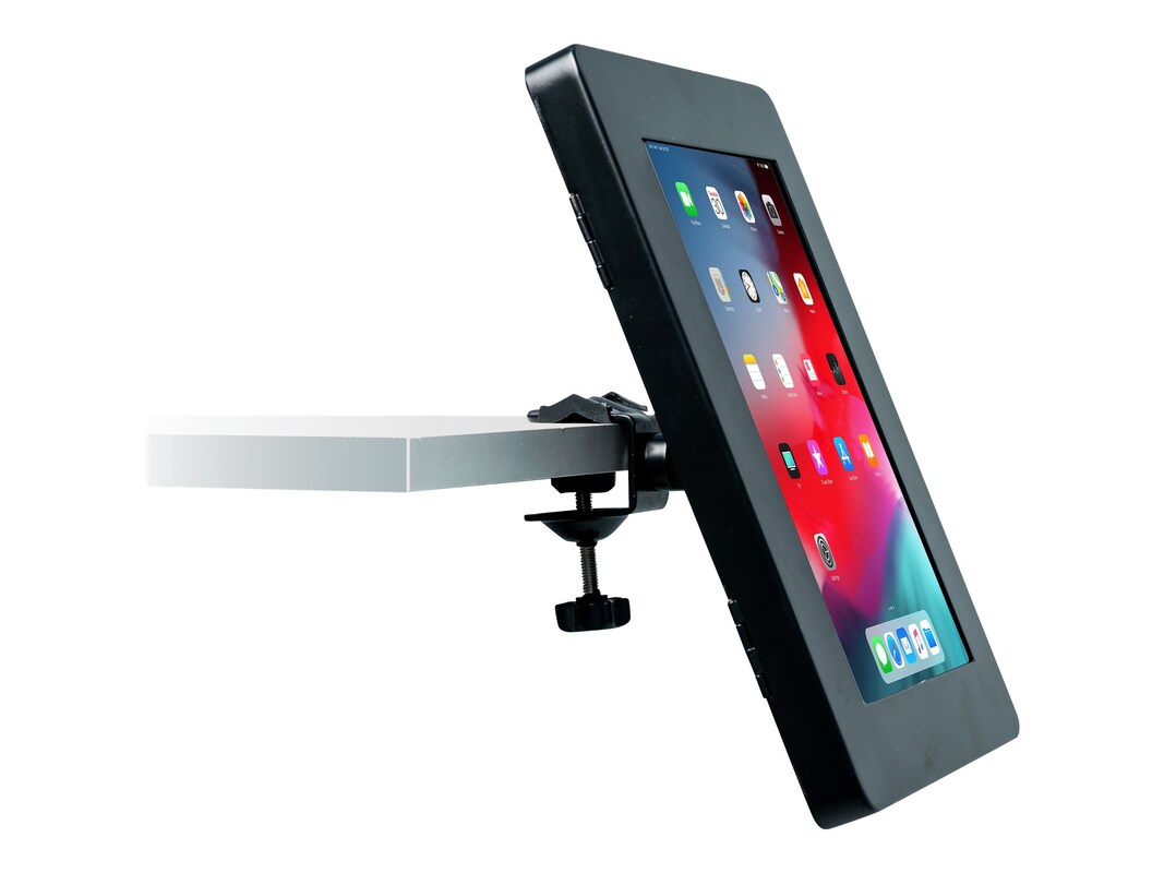 This durable, easy to use security enclosure keeps your tablet protected from theft and easily accessible in offices, classrooms, commercial kitchens, and more. The locking steel enclosure tilts for quick angle adjustment and rotates 360 degrees to accommodate portrait and landscape displays. The powerful steel clamp attaches to a shelf or table edge, while a galvanized steel security cable anchors the mount to a table leg or other permanent fixture.