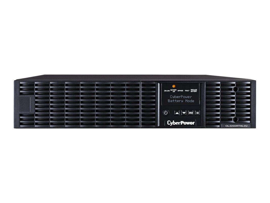 The CyberPower OL2200RTXL2UN is a rack/tower UPS with double conversion topology. It provides sine wave output to critical applications and equipment that require seamless power correction. The Extended Battery Module (EBM) expands runtime, and Fast Charge Technology restores full backup power faster. This model comes with an extendable LCD control panel, Smart Battery Management charging technology, and energy-saving GreenPower UPS ECO Mode.