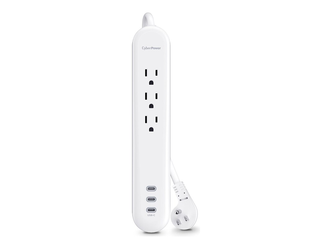 Combining form and function, the CyberPower P304UC3 Surge Protector protects electronics from harmful energy spikes and surges, and the contemporary design helps it blend into a modern home. As a surge suppressor, it will prevent electrical spikes from reaching your electronics and mobile devices. With three standard outlets and three USB-C ports, the P304UC3 can directly charge three USB-C enabled devices, while providing AC power to three additional electronic devices. Plus, it’s backed by a One Year Limited Warranty and a $25,000 Connected Equipment Guarantee.