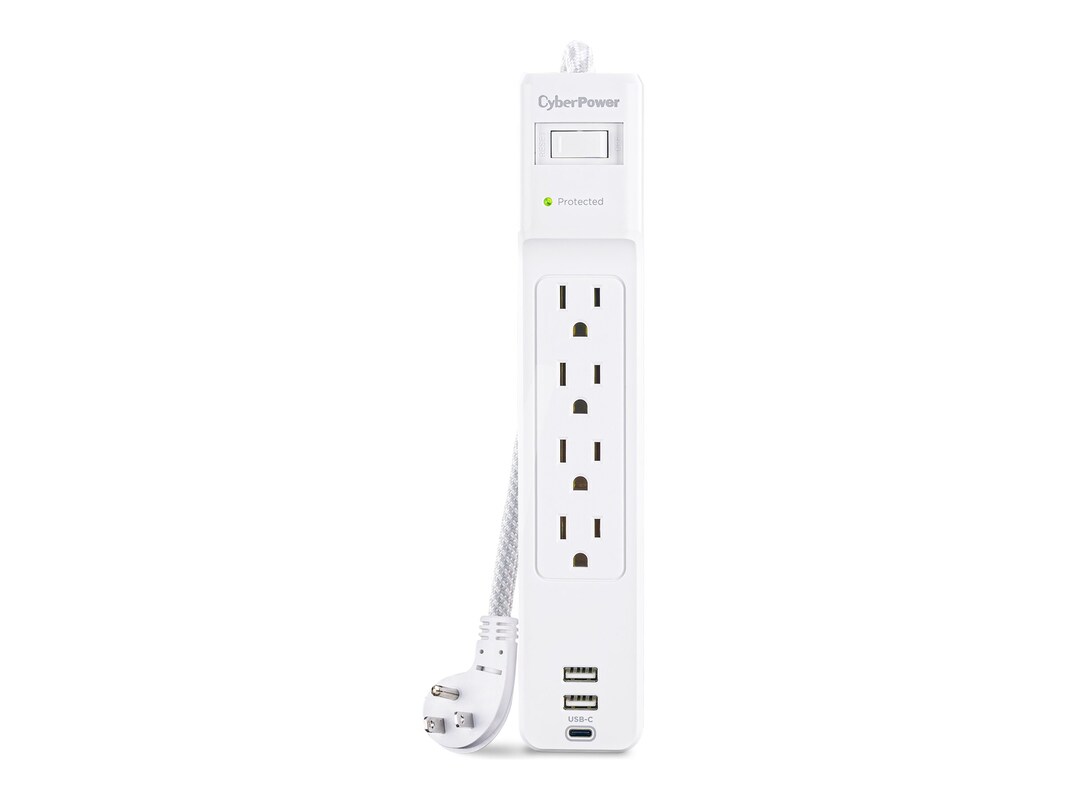 The CyberPower P405UC Surge Protector Strip prevents spikes caused by storms and electrical power surges from reaching your home electronics such as home entertainment equipment, computers, household appliances and small electronics. The P405UC provides 1500 joules of surge protection, 4 AC outlets, 1 USB-C charging port, two USB-A charging ports, and a braided 5-foot power cord with a right-angle plug.
