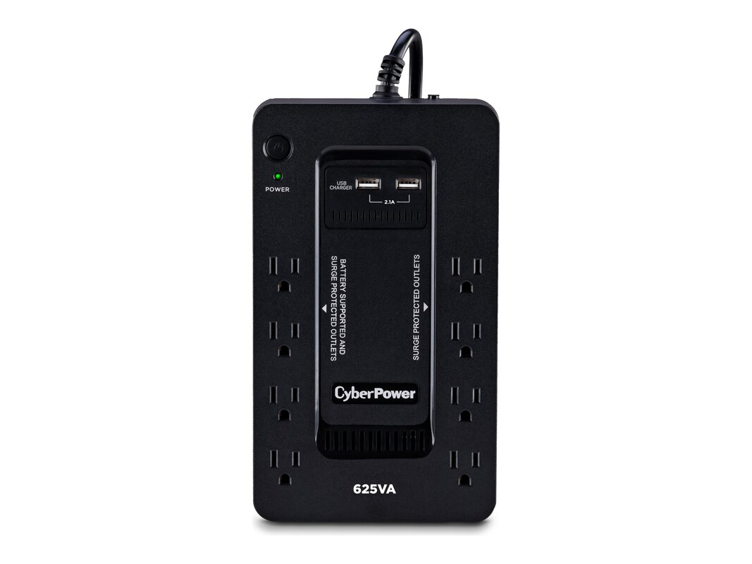 The CyberPower ST625U uninterruptible power supply (UPS) system provides battery backup and surge protection for lightning-induced surges and other power events that can damage electronic equipment. This unit delivers enough battery backup to power connected electronics through utility power failure and enough runtime to perform a graceful shutdown to protect against the loss of data and damage to valuable electronics during longer outages.