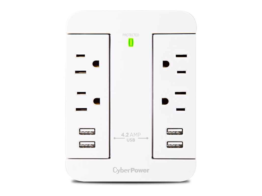 The Swivel Wall Tap, GP400U4AWH, from CyberPower expands two outlets into four outlets and four 4.2-AMP USB ports. The Swivel Wall Tap features four standard spaced outlets in two columns of two outlets for a versatile arrangement of plugs. The outlets and USB ports can swivel to fit conveniently behind furniture and appliances. This wall tap is ideal for small electronics, chargers, and household fixtures such as lamps.
