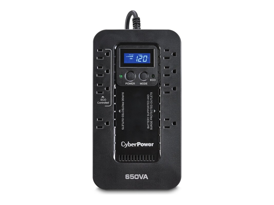 The CyberPower ECO Series EC650LCD uninterruptible power supply (UPS) safeguards PCs and other electronics (monitors, cable DSL/ modems, VoIP routers and home theater devices) from blackouts, brownouts, surges, spikes, sags and other power abnormalities. Its composite integrated circuitry offers advanced lightning protection. Patented GreenPower UPS advanced circuitry reduces UPS energy costs and is an ENERGY STAR listed product. The multifunction diagnostic LCD provides users the ability to check UPS operating status and assist in trouble-shooting power anomalies.