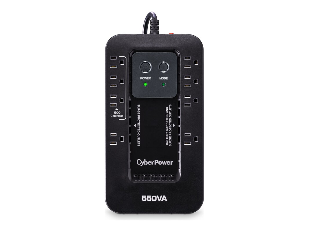 The CyberPower ECO Series EC550G uninterruptible power supply (UPS) safeguards PCs and other electronics (monitors, cable DSL/ modems and VoIP routers) from blackouts, brownouts, surges, spikes, sags and other power abnormalities. Its composite integrated circuitry offers advanced lightning protection. Patented GreenPower UPS advanced circuitry reduces UPS energy costs and is an ENERGY STAR listed product.