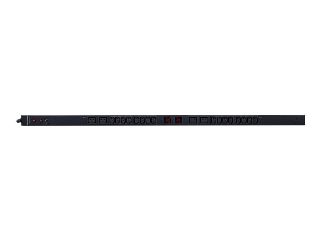 The CyberPower PDU30MVHVT20F, a 20-outlet (front), 0U vertical rackmount basic power distribution unit (PDU), provides 200/230V 30A output. It distributes power to 16 IEC-320 C13, 4 IEC-320 C19 receptacles from a single NEMA L6-30P twist lock plug with unfiltered electrical pass-through. The current draw for connected equipment is displayed in amps on the front of two LCDs for real-time load monitoring.