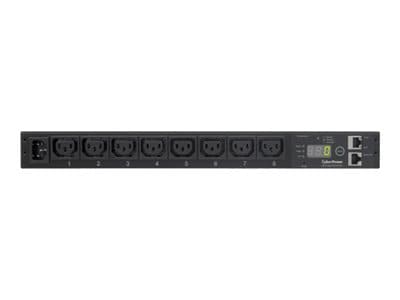 The CyberPower (PDU15MHVIEC8FNET) 8-outlet 1U rack mount monitored power distribution unit (PDU) provides 200-240V, 15A output. It distributes power to (8) IEC-320 C13 receptacles from a single IEC-320 C14 plug with unfiltered electrical pass-through. Power status can be monitored over the network using CyberPower Management Console and the RJ-45 Ethernet port for network connection, or locally using the LCD.