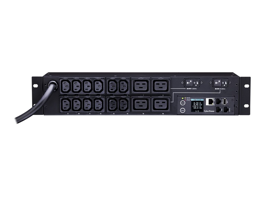 The CyberPower PDU31008, a 2U rackmount, monitored power distribution unit (PDU) provides 200-240Vac, 30A output via twelve (12) IEC C13 and four (4) IEC C19 receptacles from a single NEMA L6-30P input power plug. Configure and monitor this unit over the network using the CyberPower Management Console and the RJ45 Ethernet port for network connection, or locally from the Power Control Display.
