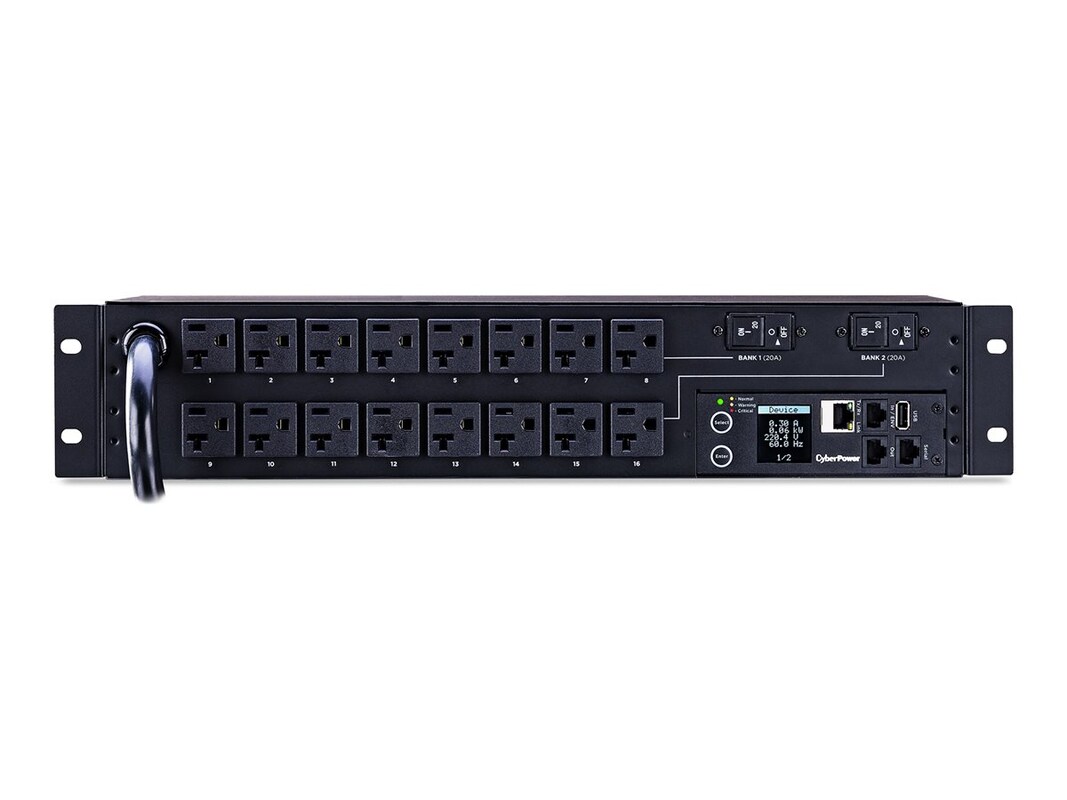 The CyberPower PDU31003, a 16-outlet (front), 2U rackmount monitored power distribution unit (PDU), provides 120V 30A output. PDU31003 distributes power to 16 NEMA 5-20R receptacles from a single twist lock NEMA L5-30P plug with unfiltered electrical pass-through. Monitor power status over the network by using the CyberPower management console and the RJ45 Ethernet port for network connection. Monitor power status locally by using the LCD.