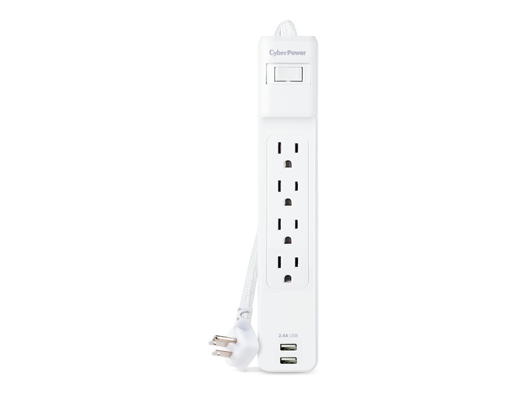 The CyberPower Surge Protector P406U prevents spikes in energy caused by storms and electrical power surges from reaching your home electronics such as audio/video equipment, laptops and desk top computers, household appliances and small electronics. The P406U provides 500 joules of surge protection, 4 AC outlets, two USB-A charging ports, and a braided 6 foot power cord with a right-angle plug.