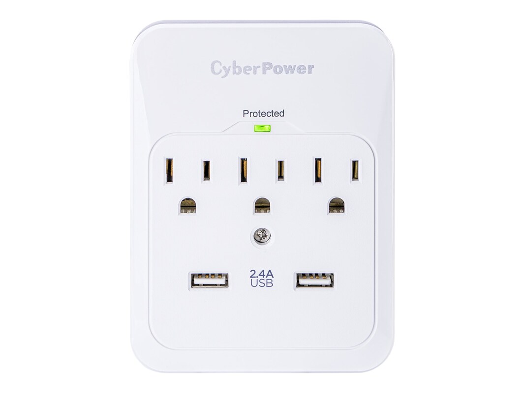 The CyberPower Professional Series CSP300WUR1 Surge Protector is ideal for Home/Office protection with 600 joules, (3) outlets, (2) USB 2.1 Amp charging ports and a convenient wall tap design. The surge protector is ideal for protecting personal computers, phones/fax/modems, printers, stereos and other electronics. Its 2.1 Amp USB charging ports are perfect for keeping tablets, smart phones and other rechargeable electronics ready to use.