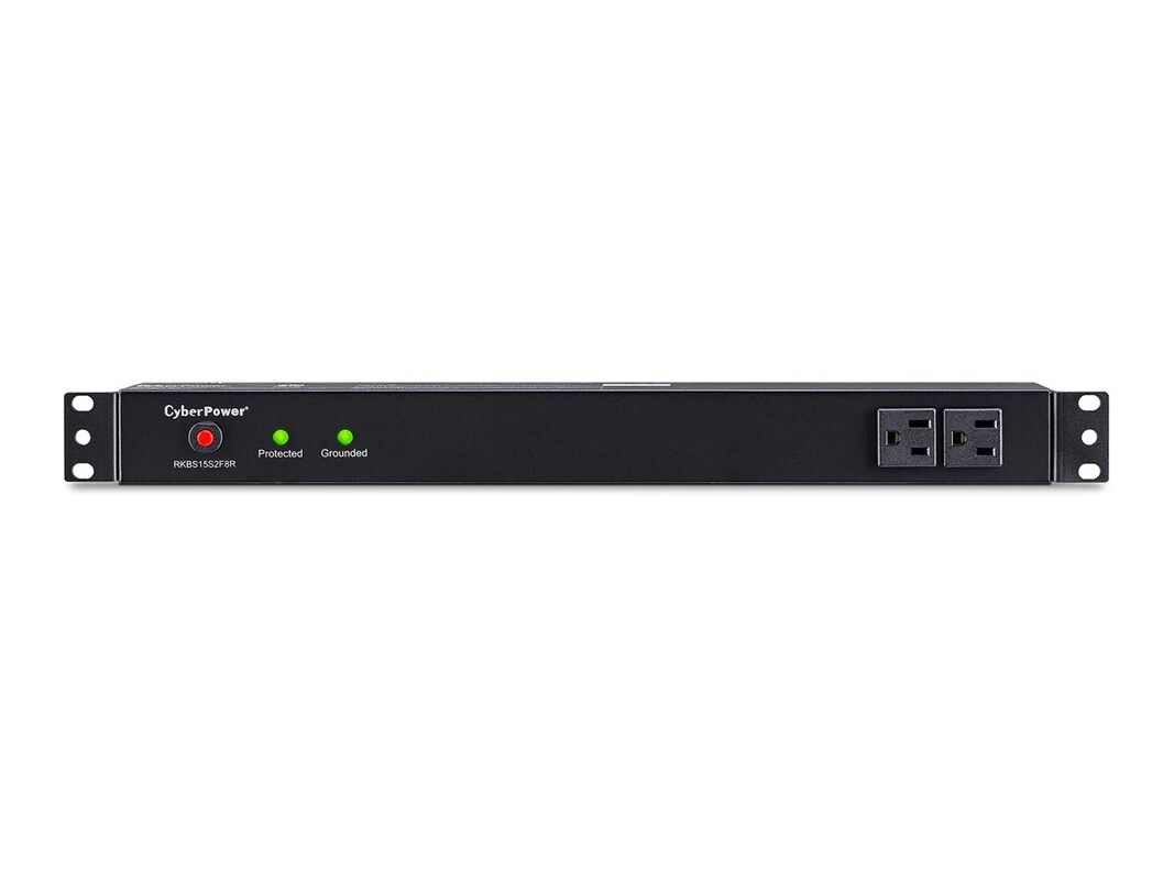 Engineered for the most demanding applications, the professional-grade Rackbar Surge Protector RKBS15S2F8R from CyberPower safeguards systems and networking equipment by absorbing spikes in energy caused by storms and electrical power surges. Designed for network environments, the RKBS15S2F8R also performs superbly for home office use, providing 3600 joules of protection, 15-Amp electrical capacity with circuit breaker, and 10 surge-protected outlets (2 front, 8 rear). Industrial-grade metal housing keeps this Rackbar performing flawlessly. Two sets of mounting brackets provide flexible installation options: 1U rackmount (19 in.); 0U vertical rackmount and under-counter configurations.Features of the RKBS15S2F8R include an EMI/RFI noise filter, LED status indicators, industrial-grade metal housing, AC power cord (15 ft.), and a cord retention tray. The RKBS15S2F8R also comes with a Limited Lifetime Warranty and a Connected Equipment Guarantee.