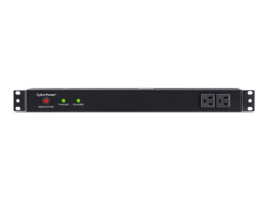 The CyberPower 12-outlet (2 Front and 10 Rear) rack mounted Rackbar surge suppressor (RKBS15S2F10R) provides 120V, 15A output and a surge suppression rating of 3,600 joules. It distributes power to (12) NEMA 5-15R receptacles from a single NEMA 5-15P plug. Designed for datacenters and other electrically demanding applications, this unit has a rugged, industrial-grade metal housing and a 15-foot AC power cord. It can be mounted either horizontally or vertically, includes a cord retention tray and is ETL/RoHS certified. A lifetime warranty and $150,000 Connected Equipment Guarantee ensures the Rackbar surge suppressor is free of defects in design, assembly, material or workmanship.