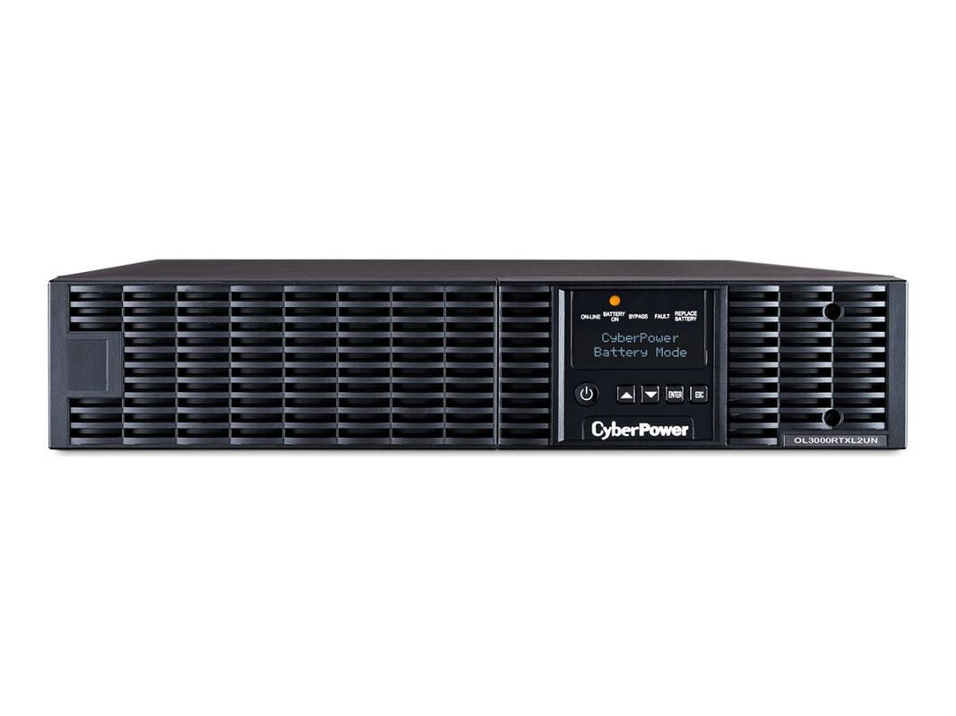 The CyberPower OL3000RTXL2UN is a rack/tower UPS with double conversion topology. It provides sine wave output to critical applications and equipment that require seamless power correction. The Extended Battery Module (EBM) expands runtime, and Fast Charge Technology restores full backup power faster. This model comes with an extendable LCD control panel, Smart Battery Management charging technology, and energy-saving GreenPower UPS ECO Mode.