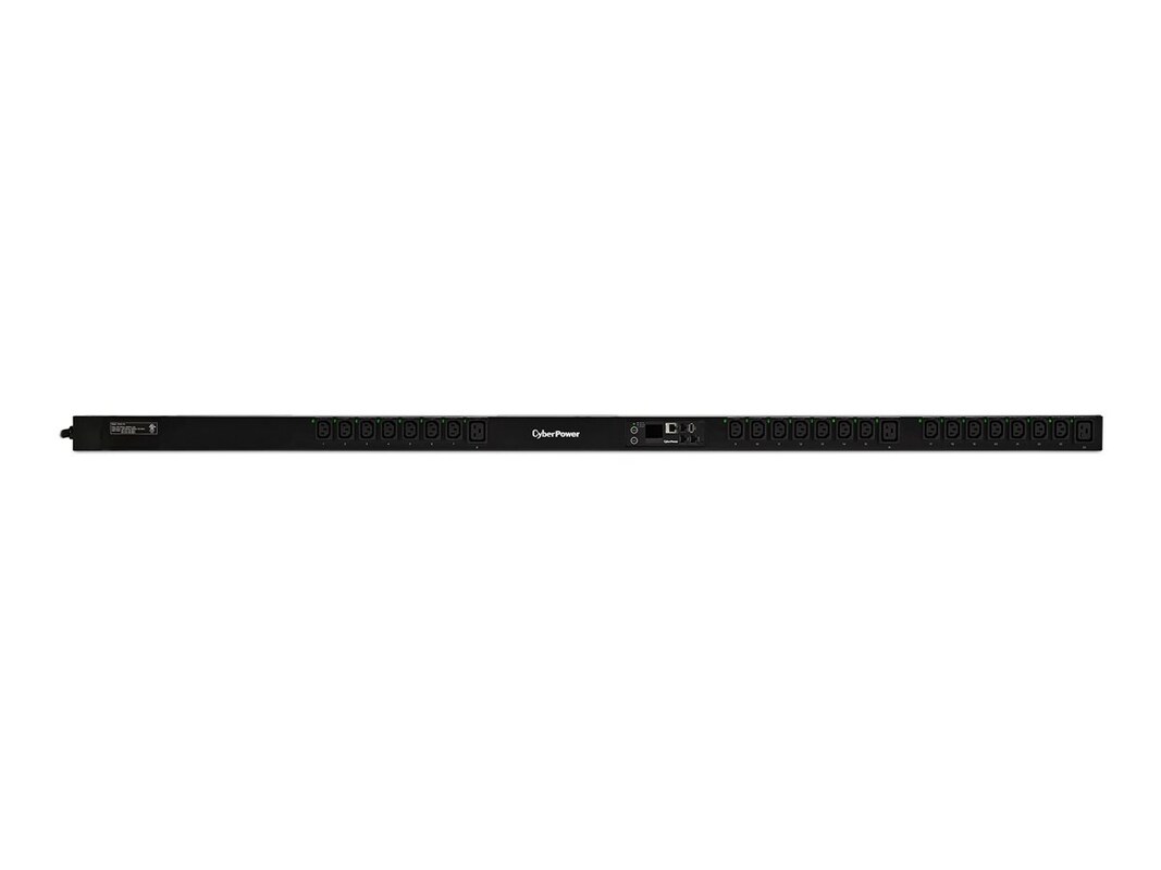 The CyberPower PDU41104, a 0U rackmount switched power distribution unit (PDU), provides 200-240V 20A output via 21 IEC-320 C13 + 3 IEC-320 C19 receptacles from a single NEMA L6-20P input power plug. The switched outlet receptacles can be managed over the network by using the CyberPower Management Console, a web browser, and the RJ45 Ethernet port for network connection, or locally from the Power Control display. The PDU41104 offers outlets that can be turned on, turned off, or recycled on demand. Outlets can be programmed to address a number of needs including remote rebooting of locked equipment, load shedding, power sequencing, and locking out unauthorized loads.