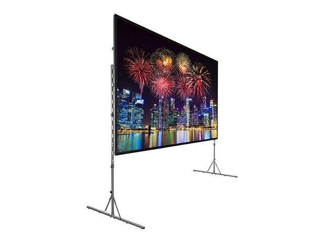 The enhanced Fast-Fold Deluxe Screen System brings an advanced approach to rental and staging applications for set-up and tear-down to accommodate all skill levels. Its new and efficient portable design features include an intuitive leg-to-frame locking mechanism with no parts to lose. This large format screen is now available with HD Rental - a foldable and optically enhanced screen surface for high-definition, up to 16K, AV experiences, featuring RF (radio frequency) welded binding for improved aesthetics and durability. Adjustable corner brace corrects frame bowing after years of use. Includes a carrying case with wheels.