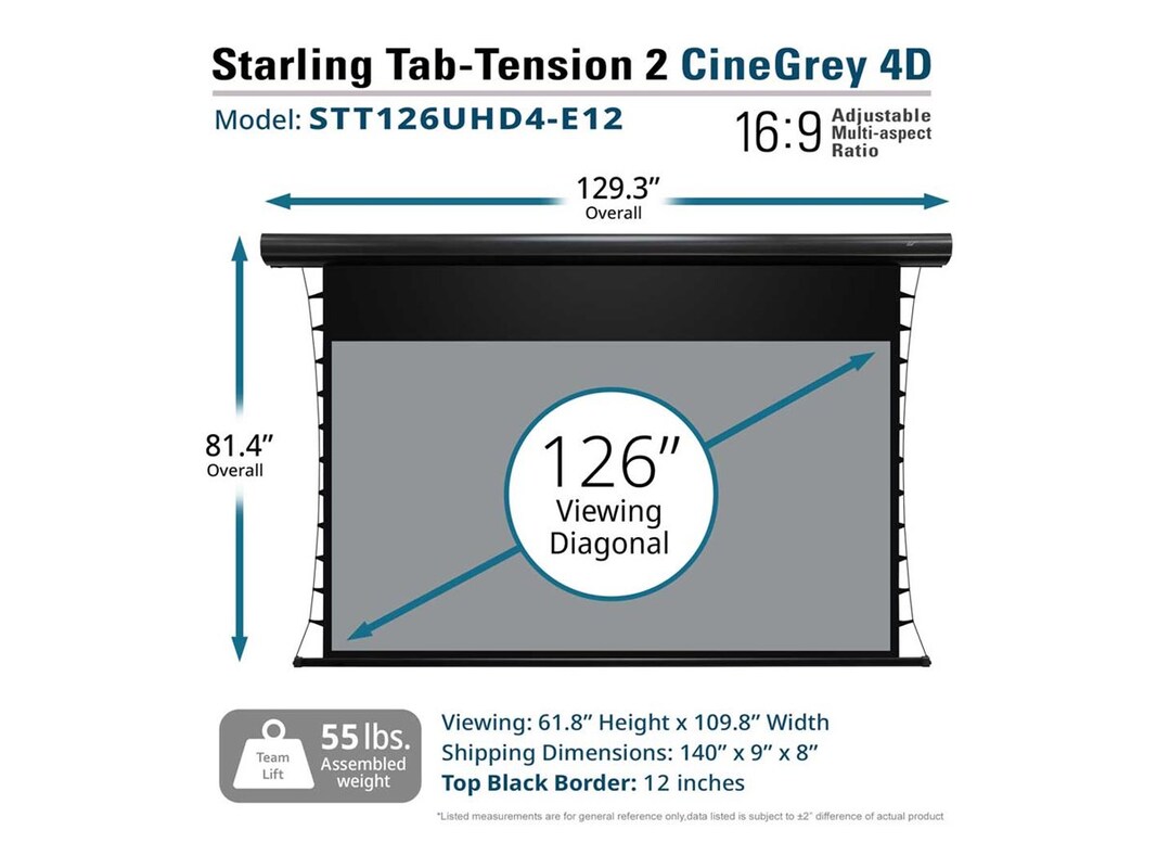 Color: BlackColor Family: BlackManufacturer Product Line: Elite Screens Starling Tab-Tension 2 SeriesModel: STT126UHD4-E12Weight Taxonomy: 54.45lbs