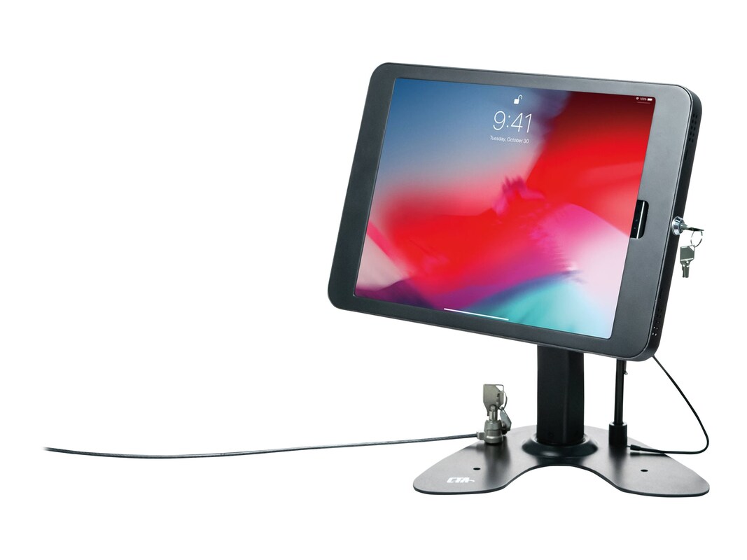 This versatile security stand makes your iPad the protected centerpiece of a streamlined workstation, kiosk display, or retail point of sale. The base rotates 360 degrees for easy shifts between customer and register sides during a transaction, while the enclosure tilts for angle adjustment and also rotates 360 degrees for portrait and landscape orientations. The locking enclosure keeps your iPad protected from theft, unlocking with a set of included keys. For an optional added measure of theft protection, a steel security cable attaches to either the stand base or back of the case, attaching at the other end to any permanent fixture. The enclosure allows full access to your tablet's ports, buttons, cameras, and headphone jack, for card reader compatibility. This kiosk features a clean cable management system, which prevents unwanted cable removal when in use. This multi-faceted approach employs slack organizing space inside the case, a rubberized cutout at the rear, and threading slots within the stand neck to keep your cable out of sight. Also included is an elegant stylus, with an elastic tether and built-in holder on the stand base. The base mounts easily to your desk, countertop, or other flat surface using either included hardware or adhesive silicone pads.