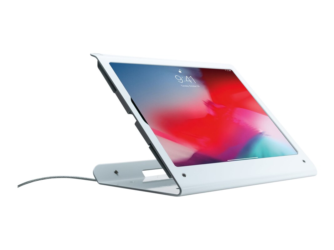 Show off your sleekly modern 3rd Generation iPad while keeping it safe and secure with the Rotating Theft-Deterrent Kiosk Stand, a comfortable addition to any point of sale, showroom, or classroom. The ultra-secure theft deterrent design means your iPad is secured to the case with four screws that can only be opened by a proprietary tool, making it impervious to lock-pickers or thieves carrying traditional tools. When it comes to mounting, this kiosk stand comes with two distinct options: First is the swivel stand, which allows the entire kiosk 360 degrees of rotation for smooth point-of-sale transactions. The second, more secure option involves using the included mounting hardware to affix the entire metal platform directly to a surface. The sleek metal design matches the aesthetics of the iPad 12.9 perfectly while simultaneously protecting the device from damage and allowing full access to the available ports and headphone jacks. The Rotating Theft-Deterrent Kiosk Stand is compatible with iPad 12.9 Gen. 3