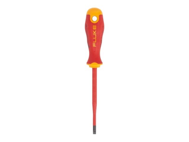 Designed to provide you with the greatest safety, comfort, quality, and ruggedness when working on energized circuits, this insulated slotted screwdriver features a slim insulated shaft that allows access in hard to reach areas and a handle size of 4.2 x 1.4" (106 x 36 mm).