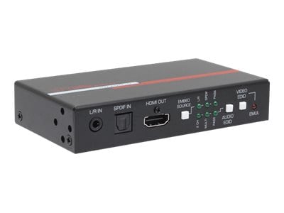 Use this compact HDMI repeater to buffer HDMI signals (helps resolve compatibility issues), and extract the stereo audio (analog L/R) from the video. The repeater consumes very little power and most HDMI sources can power it just using the HDMI connection.