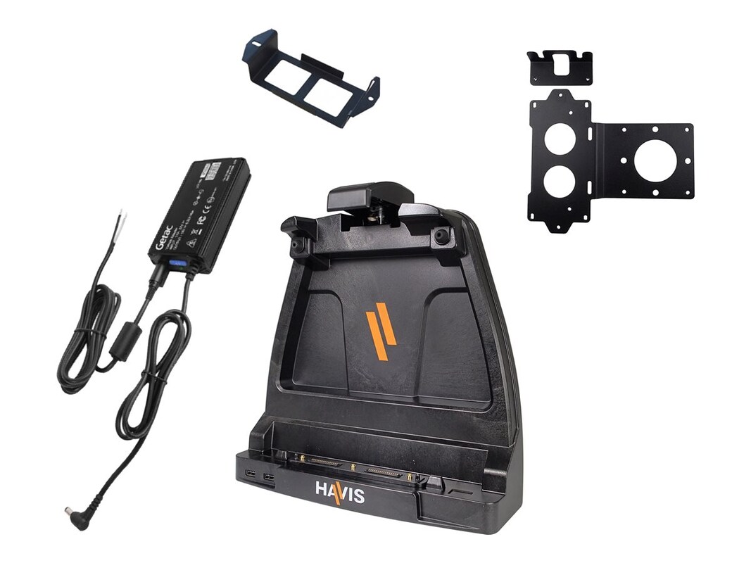 The Havis PKG-DS-GTC-902-3-BW docking station enhances the functionality of tablets with versatile connectivity options. Its robust build features rounded corners and edges, ensuring durability while maintaining a sleek appearance. With support for full port replication, this docking station provides multiple interfaces, including Serial, Network, PoweredUSB 2.0, SuperSpeed USB 3.0, Ethernet, VGA, and HDMI, allowing integration with various devices. The external power supply with bare wire adds flexibility in power management, catering to various user needs. Designed to meet SAE J1455 and MIL-STD 810H 514.8 standards, this docking station withstands demanding environments. The VESA 75 x 75 mm compatibility and keyed lock feature ensure secure installation and stability for users on the go. With a low-profile design and triple pass-through antenna connection, the Havis docking station offers functionality and convenience, making it an essential accessory for tablet users who require dependable connectivity.