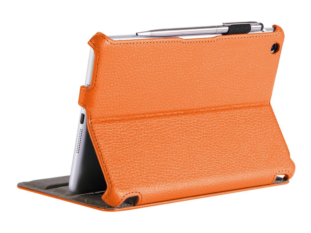 with a hardback design and folio cover, the i-Blason iPad mini slim folio case safeguards your phone from external damages. The cover can be rolled back to act as a stand, and the soft microfiber inner lining does not allow accidental slips. Your device will automatically wake up when you open the orange iPad mini retina display case. It has a convenient elastic hand strap, useful snap closure feature and an embedded stylus loop. This product comes with a bonus stylus.