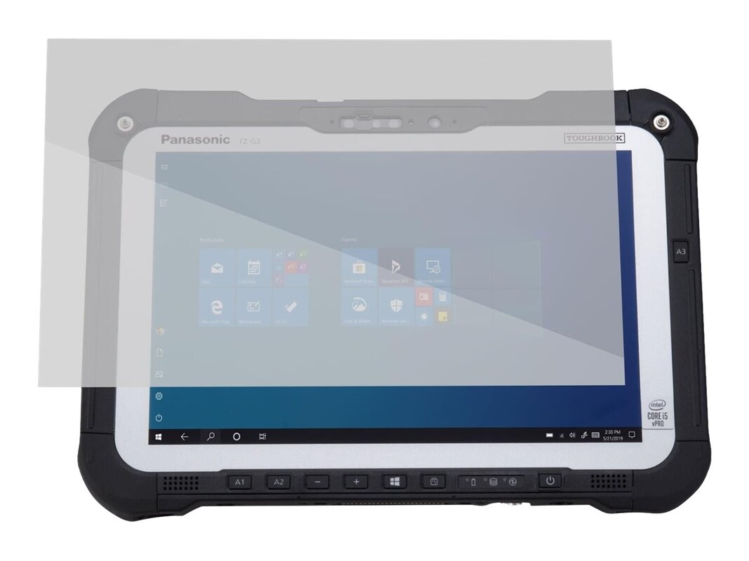 Custom fit, laser cut tempered glass privacy screen for Toughbook tablets and clamshell devices. The screen constricts the viewing angle, limiting the field of vision. The privacy screen can serve as a safety feature for in-vehicle applications where it is critical to remove distractions from the driver.