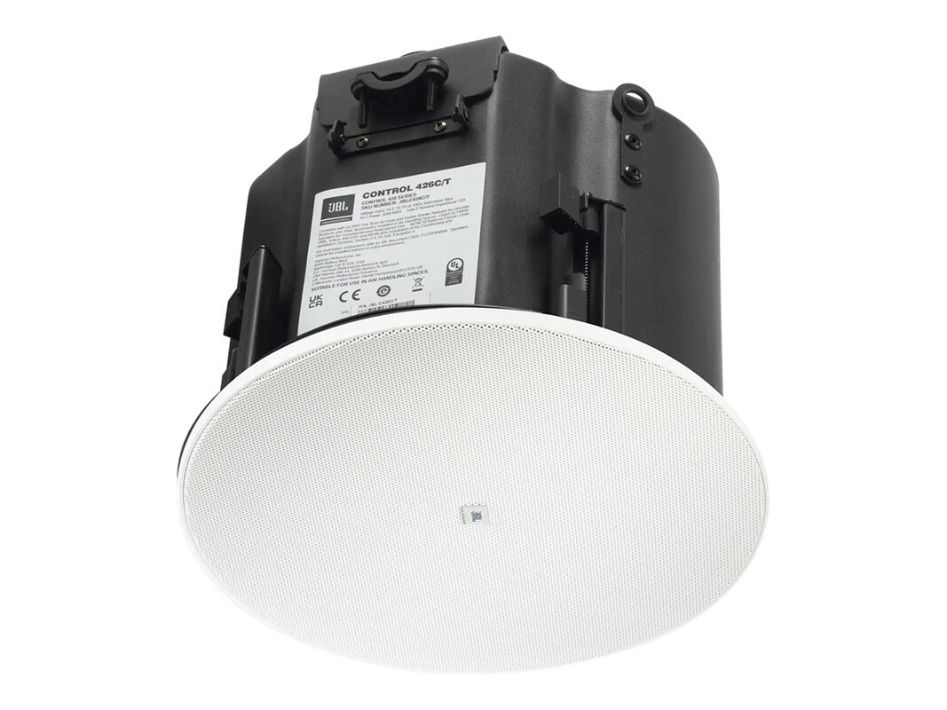 The JBL 6.5" Control 426C/T CRBI-Equipped 2-Way Coaxial Ceiling Loudspeakers feature a 6.5” woofer and integrated enclosure ideal for installation in most ceiling plenum spaces. Integrated CRBI technology provides 110-degrees of consistent, full, rich sound to the listening area. A full-face magnetic grille blends seamlessly with modern decors and mechanical improvements include redesigned terminal covers with top and side cable entry ports and an extremely reliable new dogear design that works with a wide range of ceiling thicknesses. The JBL Control 426C/T includes a transformer to support both 70V/100V and low impedance applications.