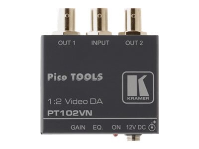 The PT-102VN is a distribution amplifier for composite video or SDI signals. It takes one input, provides correct buffering and isolation and distributes the signal to two identical outputs.