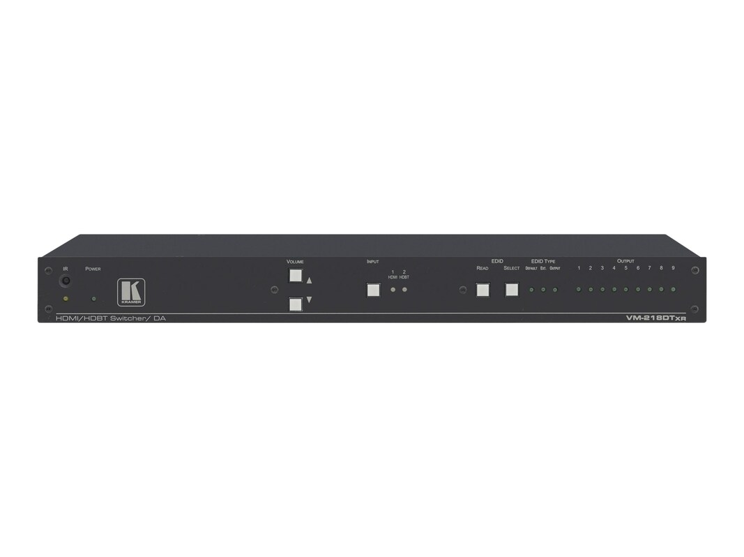 VM-218DTxr is a high-quality, extended-reach 4K@60Hz (4:2:0) HDBaseT distributor that takes either an HDMI or an extended-reach HDBaseT input (selectable), equalizes and reclocks the signal and distributes it to eight identical extended-reach HDBaseT outputs, each with its own Ethernet and RS-232/IR control signals. The unit also includes a loop HDMI output along with audio de-embedding (extraction) to analog stereo port. As an integrated extender distributor, VM-218DTxr re-extends and distributes native extended-reach HDBaseT signals with up to 4K video resolution.