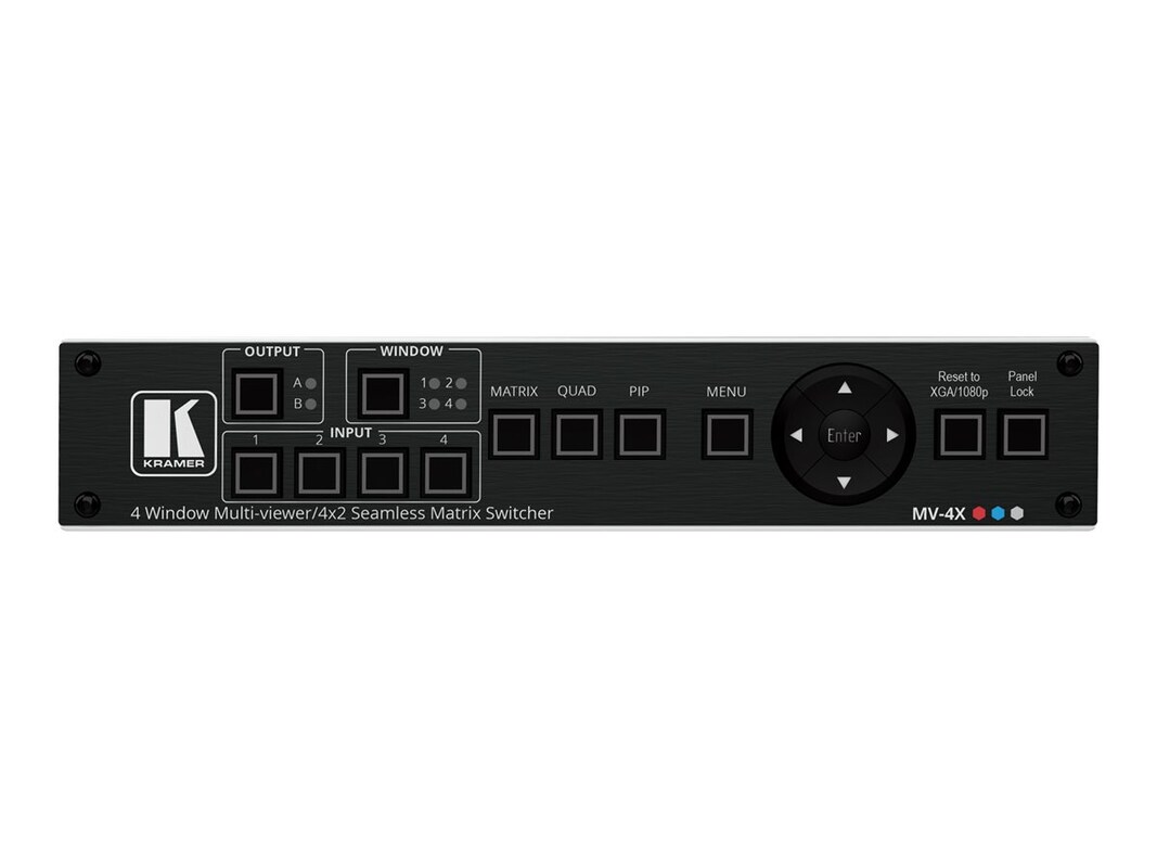 The Kramer MV-4X multiviewer system is a comprehensive solution designed for studio and production environments, offering advanced video processing capabilities and versatile connectivity options. This 1U rack-mountable unit supports 4K60 4:4:4 signals, ensuring high-resolution video management. With features like chroma key, EDID support, and HDCP 2.3 compliance, the MV-4X is equipped to handle complex video setups. Additional functionalities such as multi-view window processing, logo insertion, and picture-in-picture support enhance its utility, making it ideal for live productions. The inclusion of a power adapter and a wide range of connectors, including HDMI, HDBaseT, and USB, ensures easy integration into existing setups, while balanced audio output and comprehensive control options via RS-232 and network interfaces offer precise management of both video and audio.