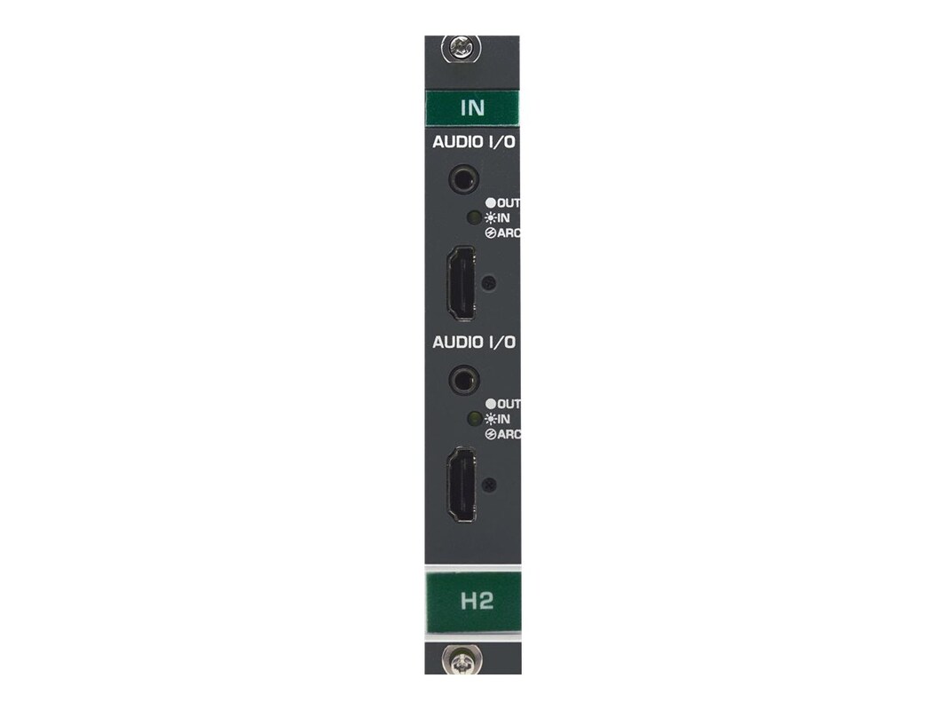 H2A-IN2-F34 is a two-channel 4K 60 Hz (4:4:4) HDMI input card with configurable analog audio features for compatible Kramer modular multi-format digital matrix switchers. H2A-IN2-F34 inputs two 4K HDMI signals with selectable ARC (on the upper port), embedded, or de-embedded unbalanced stereo audio.