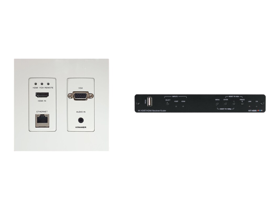 The Kramer KIT-401 from the MegaTOOLS line is a comprehensive HDBaseT transmitting system designed to meet the needs of studio and production environments. This kit includes an HDBaseT transmitter/switcher, receiver/scaler, and an audio/video switcher/HDBaseT transmitter wallplate, providing a complete solution for high-quality audio and video transmission. With support for 4K60 signals, the KIT-401 delivers vivid image clarity and superior video quality. It is HDCP 1.4 and HDCP 2.2 compliant, ensuring secure, reliable content transmission across different media. The inclusion of Power Over Cable (POC) support and a 1U rack-mountable design not only simplifies the installation process but also maximizes space efficiency, making it a suitable choice for any professional setting. Additionally, the KIT-401 features I-EDIDPro (Kramer Intelligent EDID Processing), ensuring optimal signal compatibility and performance. Suitable for live productions, studio recordings, or any other professional audio/video application, the Kramer KIT-401 offers a reliable, high-performance solution.
