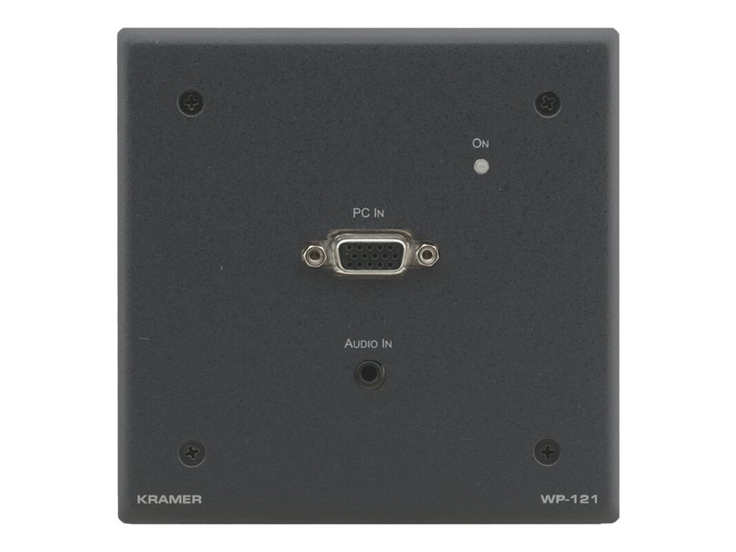 The WP-121 is a wall plate transmitter for computer graphics video signals up to and exceeding UXGA and unbalanced stereo audio. It converts the input signals into a twisted pair signal that it transmits to a compatible twisted pair receiver.