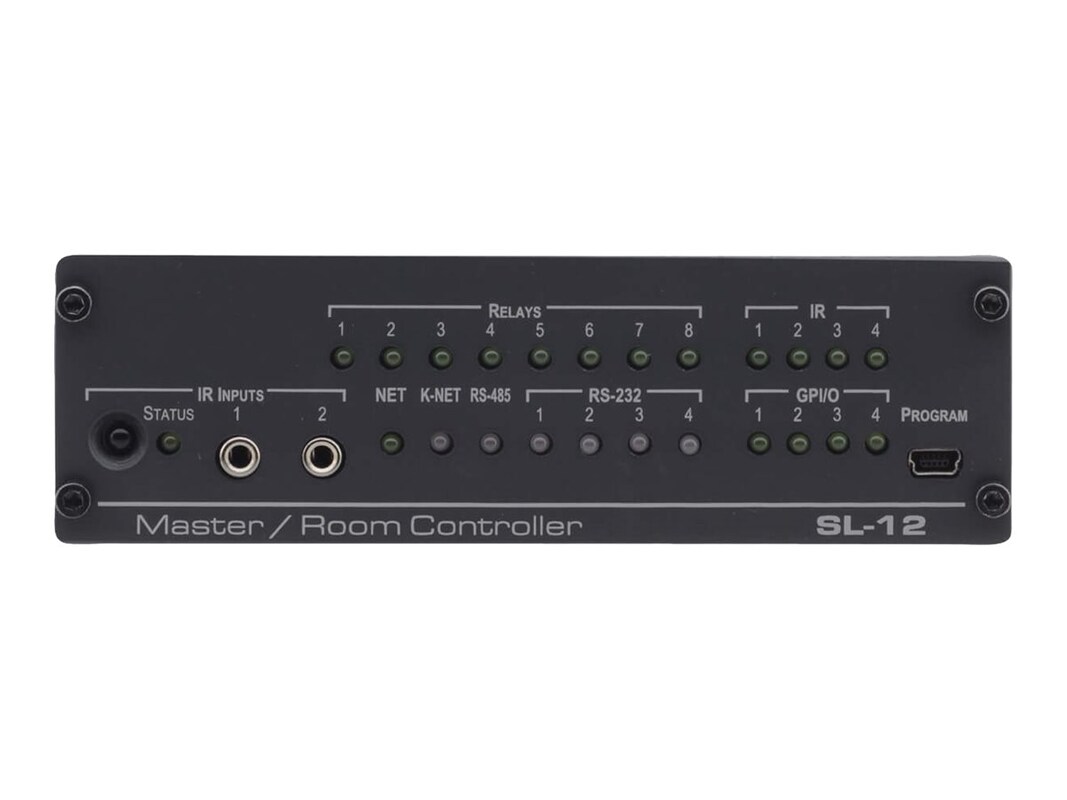 The SL-12 is a master room controller that can operate over Ethernet (LAN) with control ports that include: one bidirectional RS-485, four RS-232, four IR, four GPI/O, and eight relay. It controls devices such as scalers, video displays, audio amplifiers, DVD players, sensors, screens, shades, door locks, and lights. Multiple Kramer Ethernet gateways can be used to add remote I/O ports.