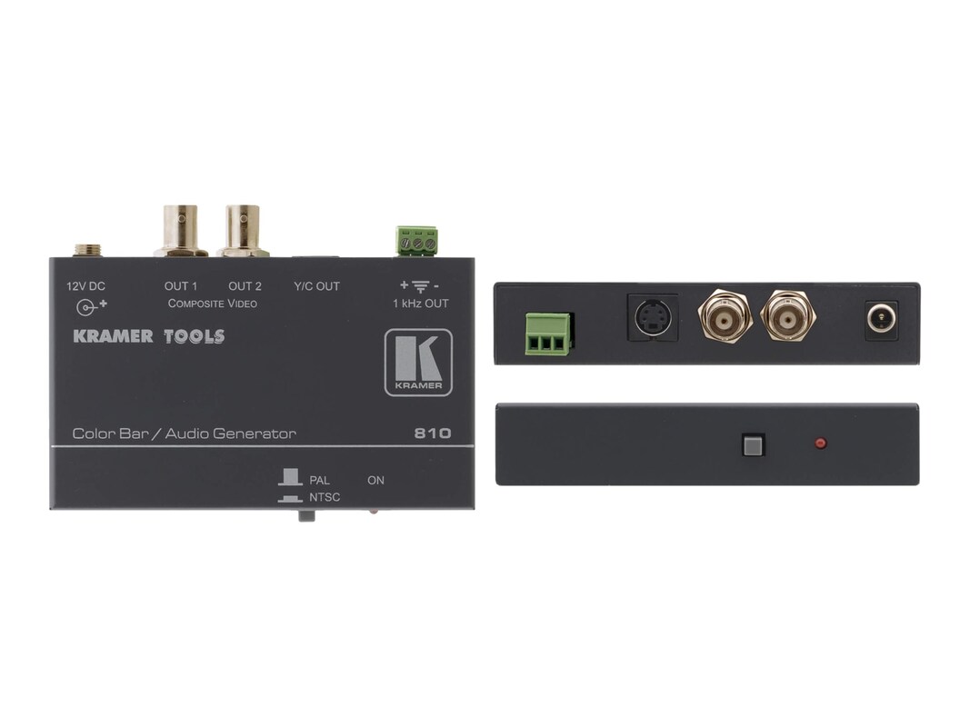 The 810 is a high-performance composite video and s-Video (Y/C) color bar and audio tone generator. It outputs two composite video and one s-Video color bar signal in either NTSC or PAL, and an audio tone simultaneously.
