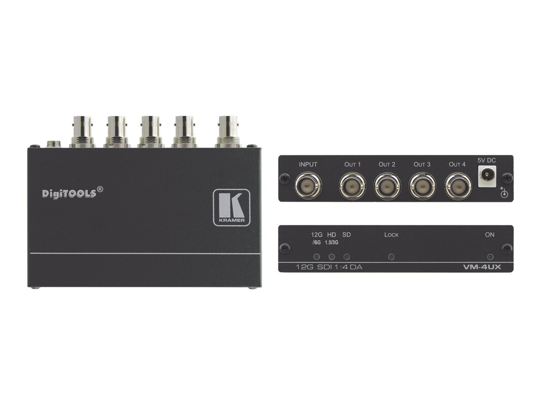 The VM-4UX is a compact and high-performance 1:4 4K distributor for standard broadcast-grade SDI signals of up to 12G transmitted data rate. It auto-adapts to the data rate of one SDI input signal, equalizes and re-clocks the signal to improve transmitted signal reach, and distributes the signal to four identical SDI outputs.