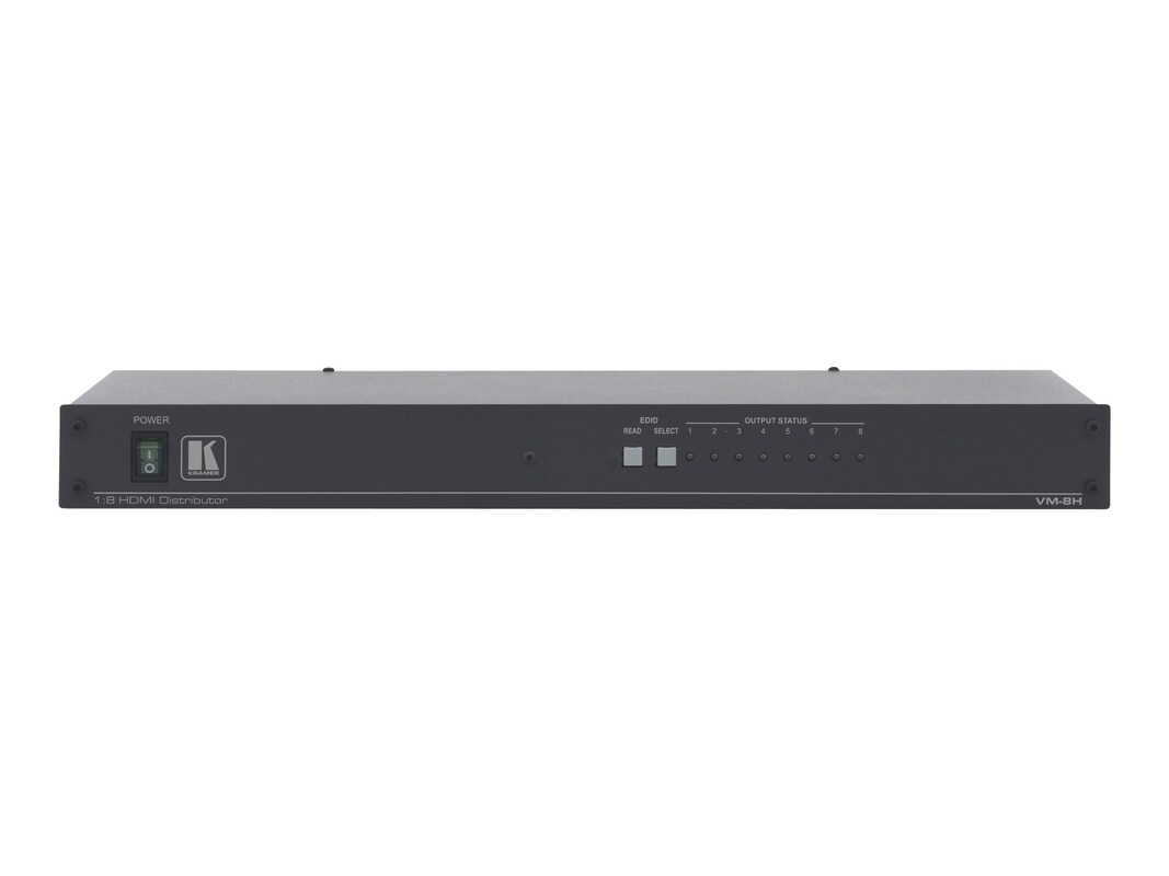 The VM-8H is a distribution amplifier for HDMI signals. It reclocks and equalizes the signal and distributes it to 8 identical outputs.