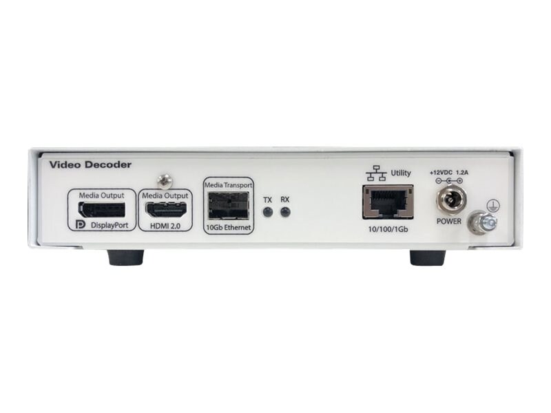 ZyPer4K HDMI 2.0 output and DisplayPort Decoder, accepts IP streaming via 10Gbit/fiber. Supports analog audio, IR, RS-232. No USB. Includes power supply. Requires ZyPer4K Encoder. Cables not included.