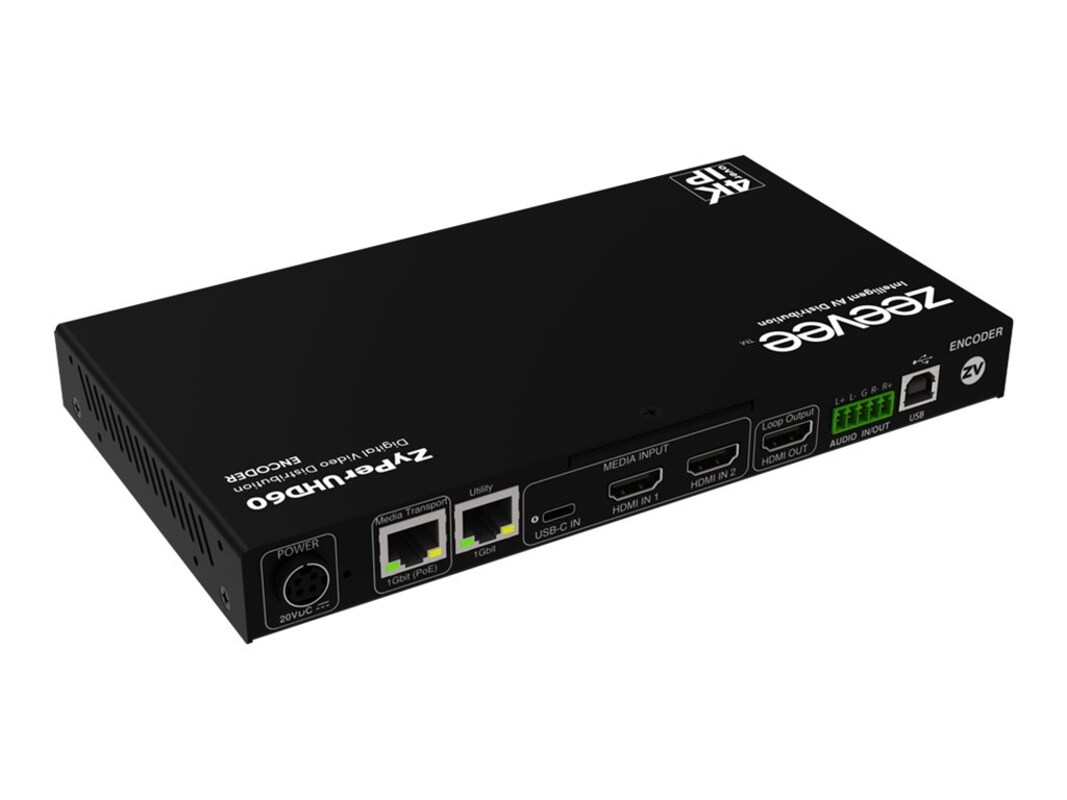 ZUHD60-2EMP is an HDMI 2.0a, Switching, triple-input AVoIP Encoder (Dual HDMI and USB-C) that is part of the ZyPerUHD60 product line. It supports IP streaming up to 4KP60 4:4:4 resolution with embedded audio and HDCP 2.3 encryption. Includes integrated ZyPer Management Platform running on a dedicated processor. This encoder has a 5-pin Phoenix/Euroblock connector for analog audio in/out and Gigabit copper. Other features include USB-A, IR, RS-232 (via 3-pin Phoenix/Euroblock), and HDMI loopout.