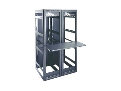 WS Series Laminate Writing Shelves feature an attractive 1" thick graphite-marbled laminate surface with a durable black T-mold edging. The supplied mounting system consists of sturdy steel-tubes that attach at both front and rear rackrail in each rack bay and extend beneath each writing shelf providing support. Additionally, each writing shelf includes cable pass-through holes with grommets providing effective cable management for laptops, computer keyboards, etc. Each writing shelf precludes the use of two front and two rear rackspaces.