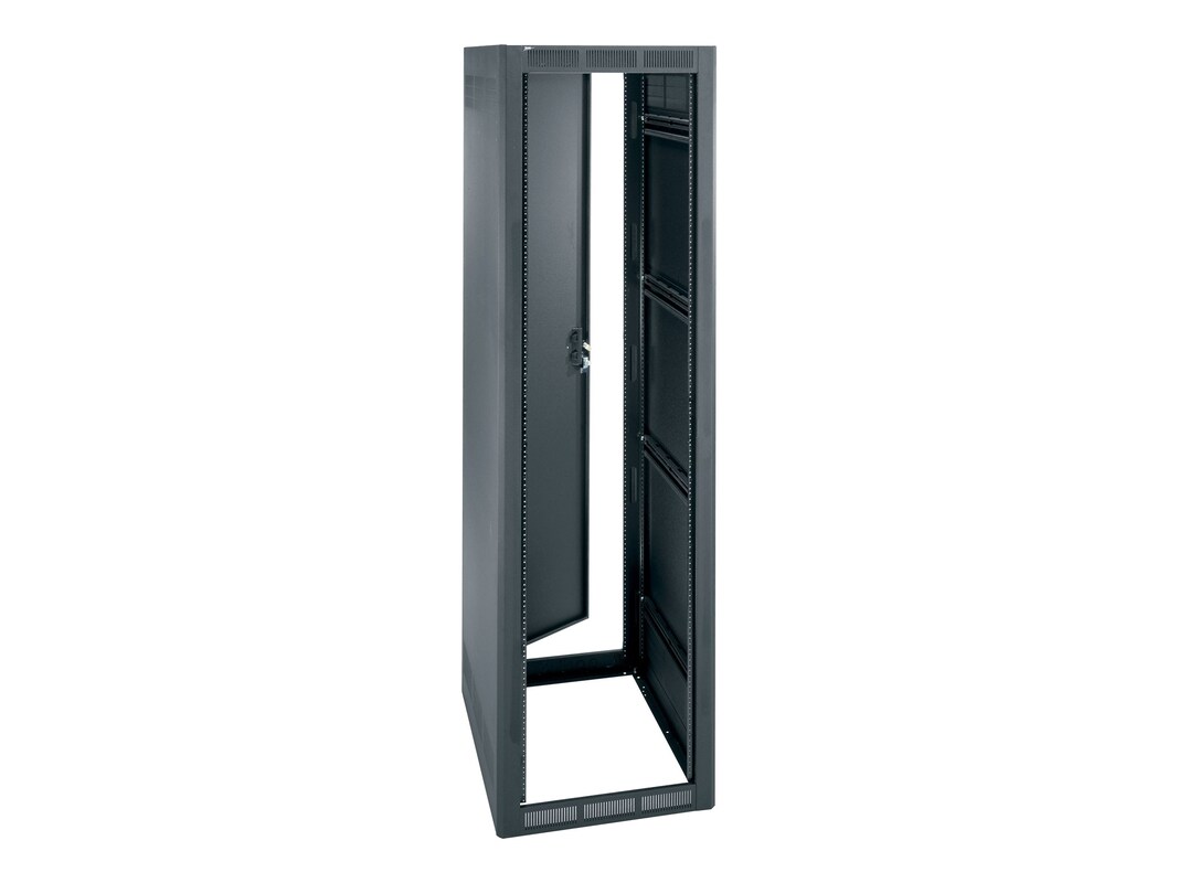 The WRK-SA series racks, with a wider footprint, are designed to accommodate equipment that requires thicker cable bundles or enhanced cooling airflow. This stand-alone installation version features fixed solid sides, offering security and controlling airflow. With an overall width of 24-¼", the racks provide ample space for side cabling or cooling airflow. The WRK-SA series boasts fully welded construction for strength and durability, convenient lacing points, and slotted rail brackets for efficient cable management. It includes standard front and rear adjustable 10-32 threaded rackrail with numbered spaces, and extra-wide rackrail with cable pass-throughs for seamless front-to-rear cabling. Additionally, each rack comes with a standard configurable rear door.