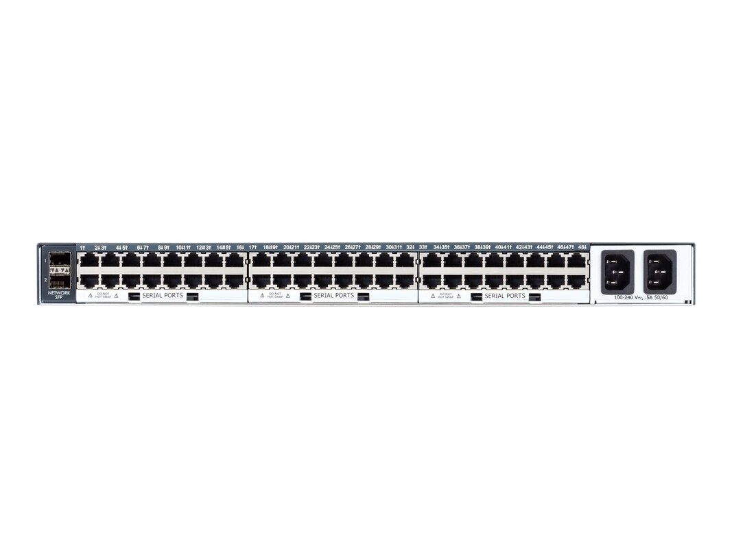 Integrated dual 1 Gb Ethernet or dual 1 Gb SFP interfaces. HTML5 support for Java-free web based telnet/SSH remote access to console ports that is browser independent. Provides multiple layers of out-of-band access with optional dial-up and cellular technologies. Reduces operating costs and security risks by eliminating the need for on-site interventions. Simplifies service deployments and balances CAPEX and OPEX with its modular design. Minimizes cable clutter with software-reversible device port pins. Increases testing productivity and efficiency as a DUT (device under test) aggregation tool. Protects management interfaces with authentication and FIPS 140-2 compliant encryption. Built-in support for environmental sensors and dry contact access control devices.