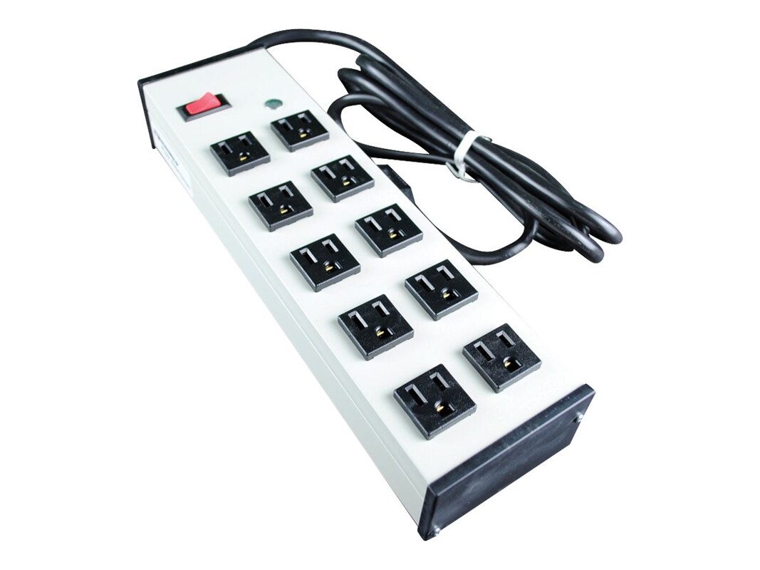 The Wiremold UL210BC is a versatile and durable power strip designed to efficiently meet your electrical needs. Featuring ten outlets, this power strip provides ample connectivity options for multiple devices, making it ideal for both home and office environments. Constructed with rugged gray aluminum housing, the UL210BC is built to withstand demanding use while maintaining a sleek appearance. It has a robust 15A rating and includes a convenient lighted switch for easy monitoring of power status. The unit comes equipped with a 6-foot (1.8-meter) 14/3 SJT black cord, fitted with a NEMA5-15 plug for reliable connectivity. Measuring 13 inches (330mm) in length and 3 1/2 inches (89mm) in width, this power strip is compact yet capable. The receptacle spacing features a center-to-center distance of 1 15/16 inches (49mm), accommodating various plug sizes and shapes, including larger transformers. With a snap-on, slide-off mounting system, installation and repositioning are hassle-free, providing flexibility for any workspace configuration. The Wiremold UL210BC combines functionality, durability, and convenience, making it an essential addition to your power distribution setup.