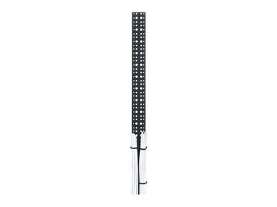 Perforated steel lacer strip mounts vertically to rack rail brackets and provides many locations to secure vertical cabling. 2" width for high capacity. Includes slip-on posts for fast pre-wrapped cable bundle installation. Also includes round holes for versatility. Accepts ASP-OWP anti-slip cable pads. Steel construction with black powder-coat finish.