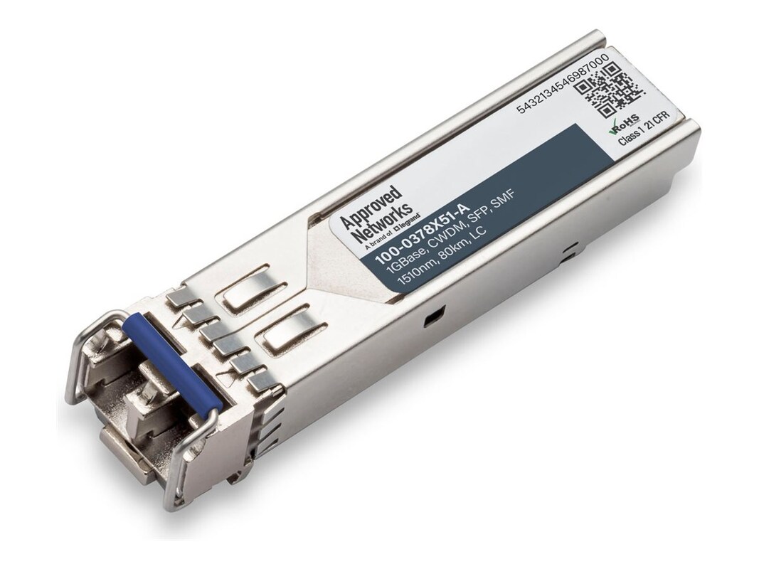The Approved Networks transceiver module from Legrand represents an advancement in repeaters and transceivers technology, offering connectivity and performance. With its Ethernet 1000Base-CWDM technology, it ensures high-speed data transfer rates up to 1.25 Gbps, making it a suitable solution for demanding networking environments. The module's ability to operate across a wide temperature range, from -40 °C to 85 °C, ensures reliability in various operational climates. Additionally, its support for long-distance networking up to 80 km with an optical wavelength of 1510 nm, coupled with features like Distributed Feedback Laser (DFB) and CWDM technology, makes it a versatile choice for expanding network capabilities. The inclusion of Digital Diagnostics Monitoring (DDM) and Digital Optical Monitoring (DOM) support enhances its value, providing real-time insights into system performance and facilitating easier maintenance. Compliant with MSA and SFF-8472 standards, this plug-in module is a testament to Legrand's commitment to quality and innovation in networking solutions.