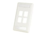 Single Gang Plastic Faceplate accepts four rear loading high density tool-less jack (HDJ) or modules and includes snap-in label fields.