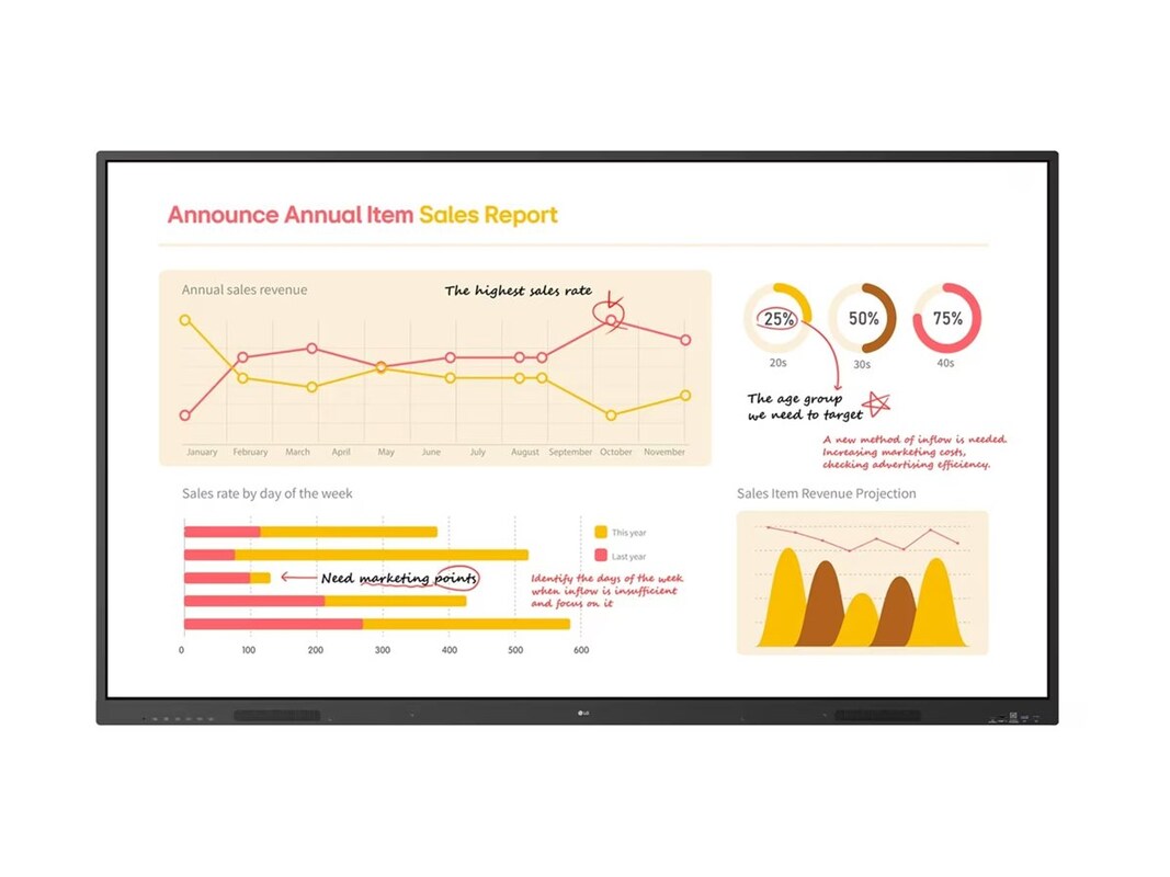 The LG CreateBoard Core 75TR3BQ-B is designed for both education and business environments, offering a seamless integration of technology with user-friendly features. This 75-inch 4K UHD display boasts a resolution of 3840 x 2160, ensuring clarity for detailed presentations or collaborative work. With up to 16 hours of operating hours and a viewing angle of 178 degrees, it is ideal for various settings, accommodating multiple viewers without sacrificing image quality. Featuring a built-in audio system with an output power of 32 watts, the display provides clear sound to enhance presentations and meetings. It supports a range of connectivity options, including USB-C with 65W Power Delivery, HDMI, and LAN input, allowing for easy integration with existing technology. The LG CreateBoard Share feature enables wireless content sharing, making it a solution for interactive learning and collaborative work environments.