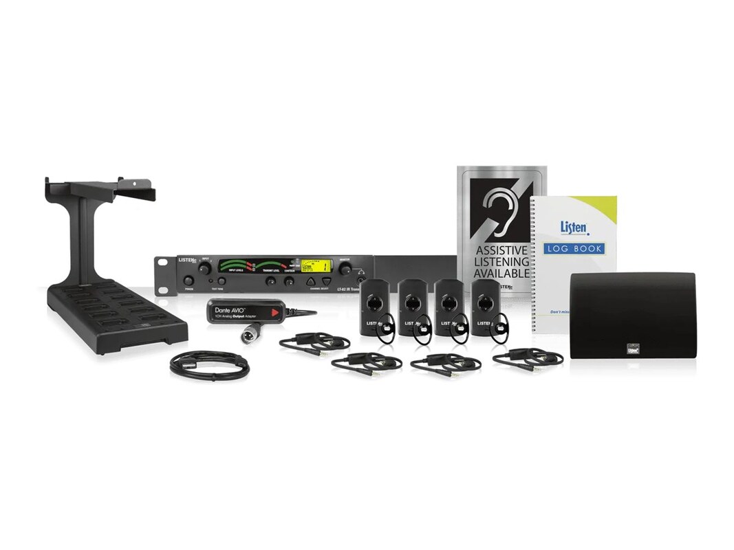 The Listen Technologies ListenIR iDSP Dante is designed for audio distribution, catering to various environments needing efficient and high-quality sound. It includes necessary components for setup, such as a transmitter unit, receiver unit, and an IR emitter, ensuring straightforward installation and operation. With its Dante audio network interface, this wireless audio distribution system provides a reliable solution for diverse audio applications, effective for enhancing communication in settings like schools, conferences, and public venues.
