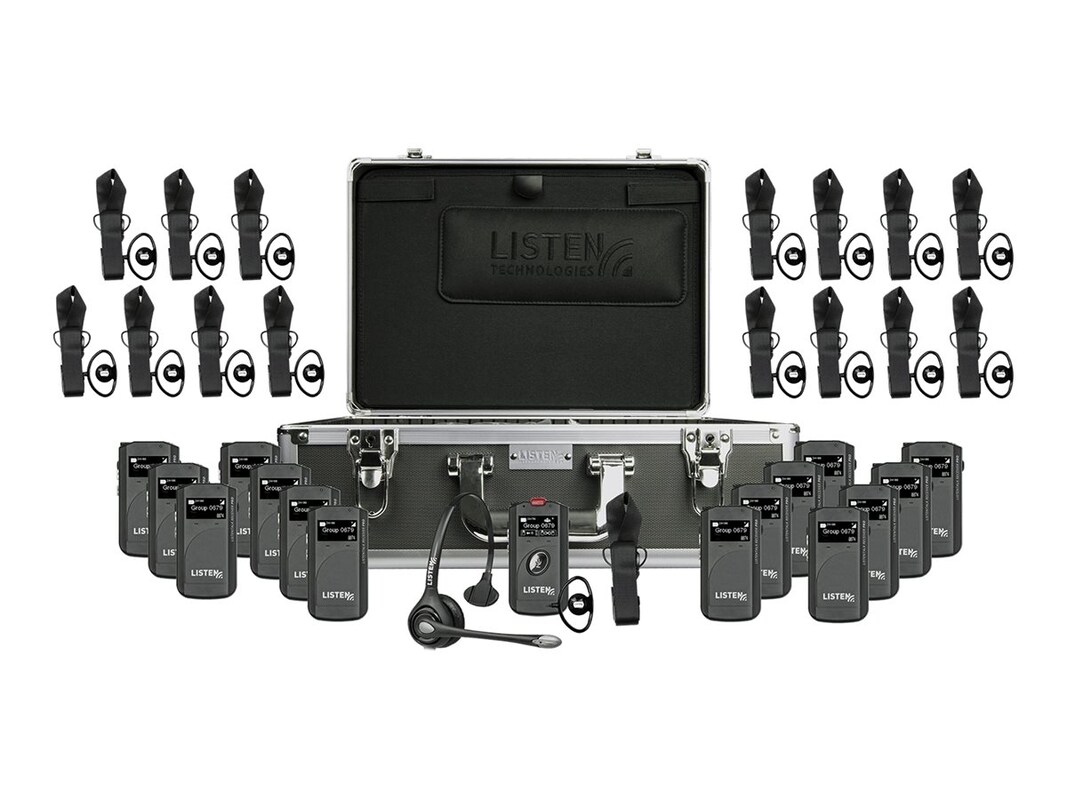 The ListenTALK GR16 System is designed for portable wireless one-way communications with one leader and seven participants. Easy to set up via software, Charging Case or Near Field Communications (NFC), it is excellent for tours, simultaneous interpretation, training, etc. This system consists of an LK-1 ListenTALK Transceiver, fifteen LKR-11 ListenTALK Receiver Pros, an LA-481 Docking Station Case 16 and an LA-452 Headset 2 (Overhead w/ Boom Mic).